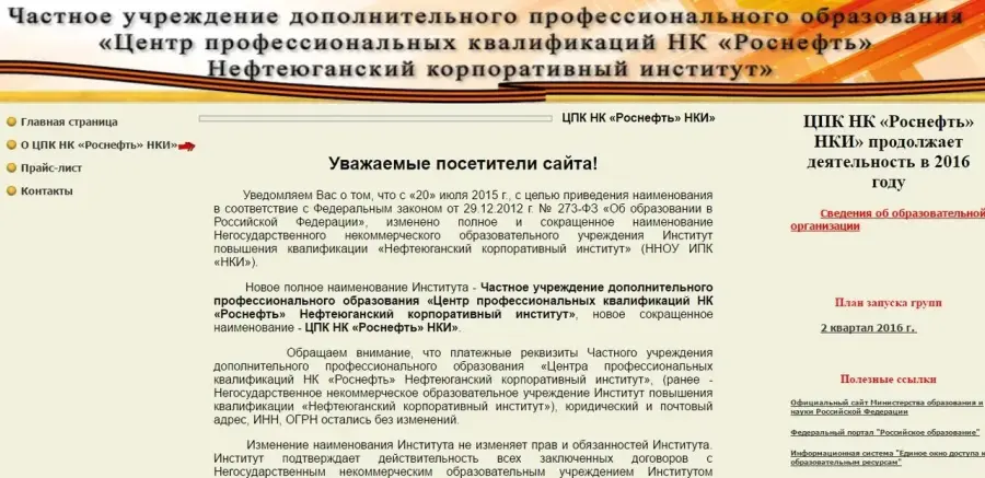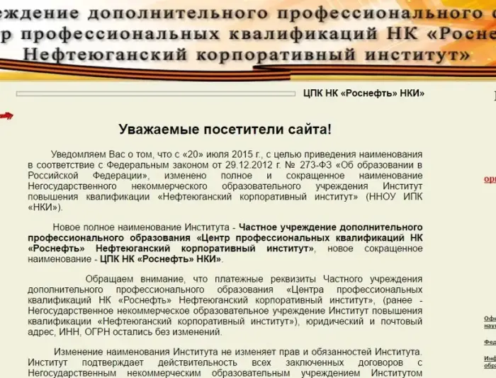 Частное учреждение дополнительного профессионального образования «Центр профессиональных квалификаций НК «Роснефть» Нефтеюганский корпоративный институт», сокращенное наименование - ЦПК НК «Роснефть» НКИ. Подробности по телефону.