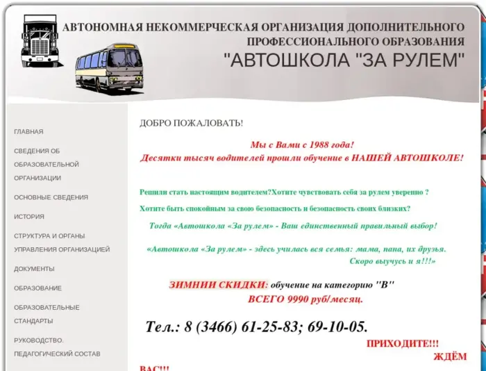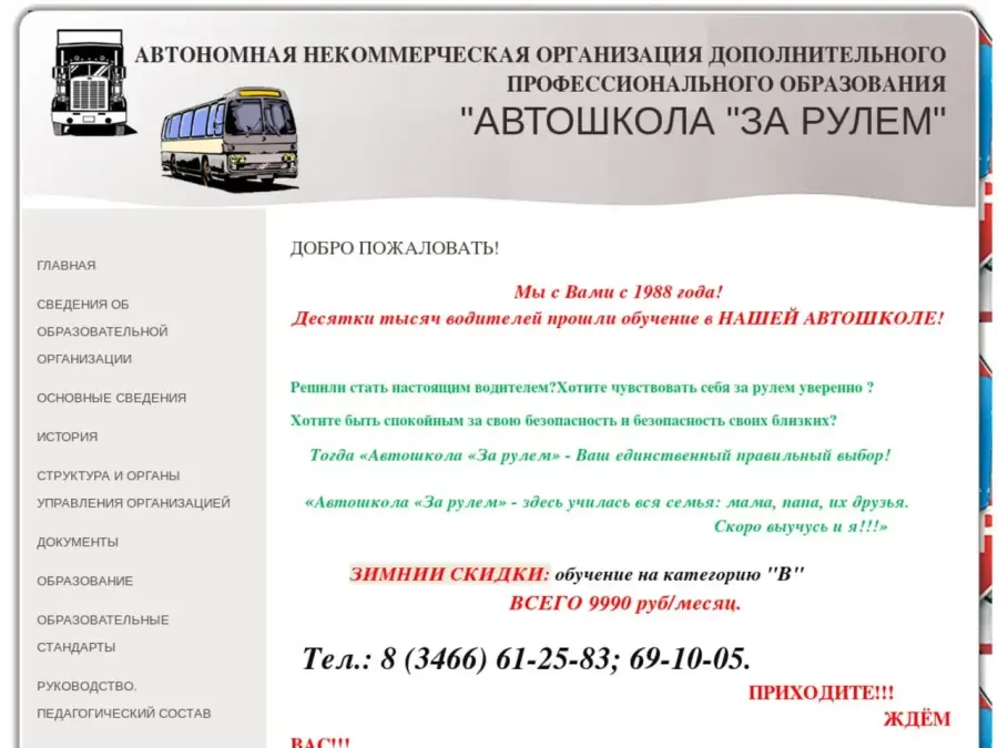 Автошкола «За рулем» - это большие, светлые учебные кабинеты, компьютерный класс, кабинет по предмету «Первая помощь», оснащенные новейшим оборудованием. Приглашаем Вас обучиться по программам подготовки (переподготовки) водителей автомототранспортных средств категорий: "A", "B", "C", "D", "CE", "M"; с категории "B" на категорию "C", с категории "B" на категорию "D", с категории "C" на категорию "B", с категории "C" на категорию "D", а также получить подготовку рабочих по профессиям (контролер технического состояния автомототранспортных средств - 5 разряда; слесарь по ремонту автомобилей – 1-6 разряд) и повышение квалификации (ежегодные занятия с водителями автотранспортных организаций; защитное вождение; особенности эксплуатации автомобиля в зимний период; руководителей и специалистов, связанных с обеспечением безопасности дорожного движения).